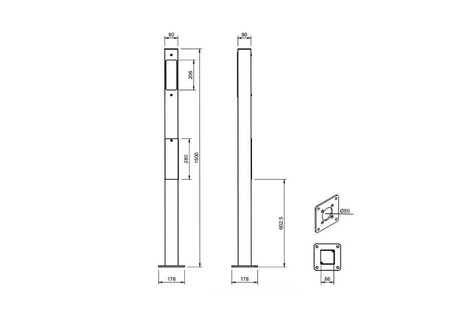 De voetplaat bevat een DIN-rail met ruimte voor een verticaal gemonteerd DIN-aansluitkit (tot 5 polen) en heeft een voetplaat met een C/C 140 mm boutpatroon voor compatibiliteit met standaardfunderingen of de ONEPOLE PRO Base Mount-fundering.